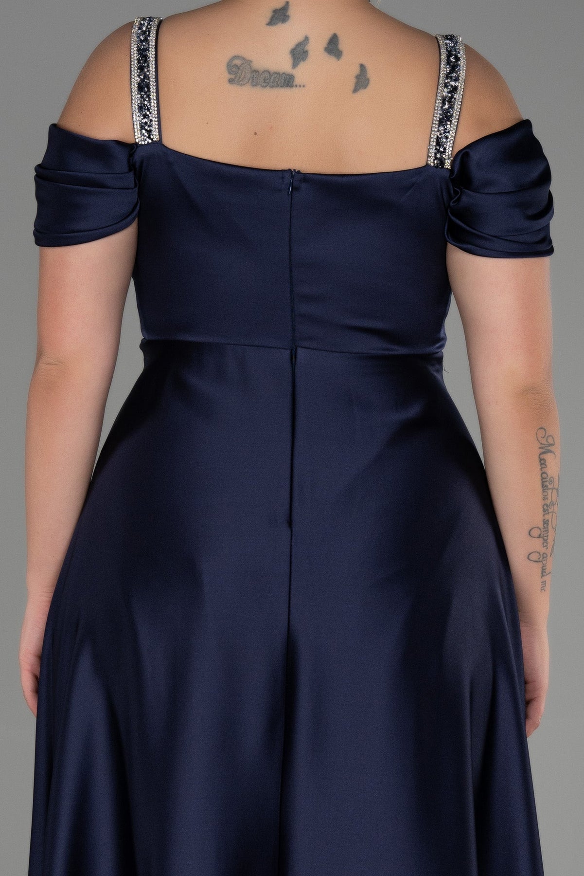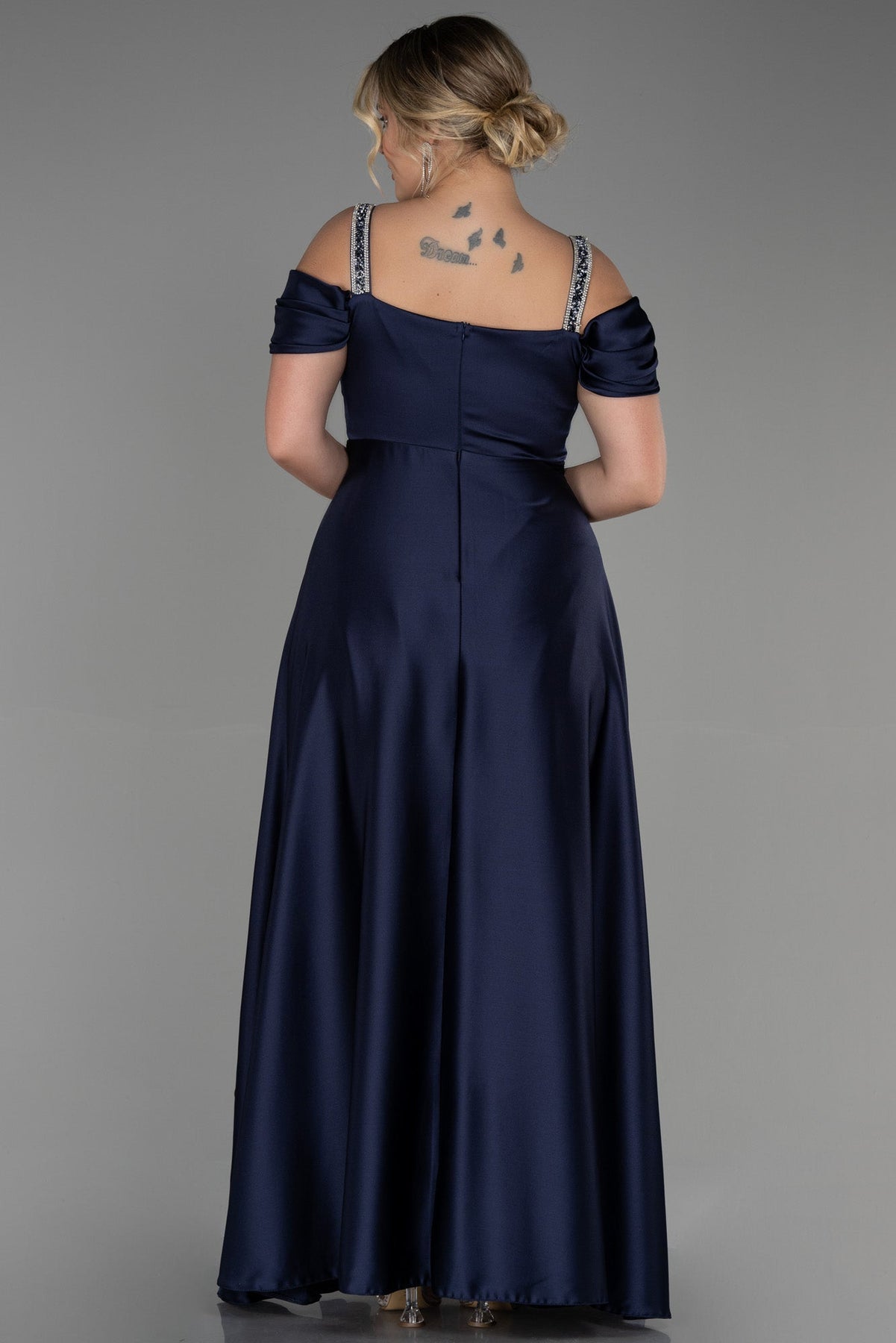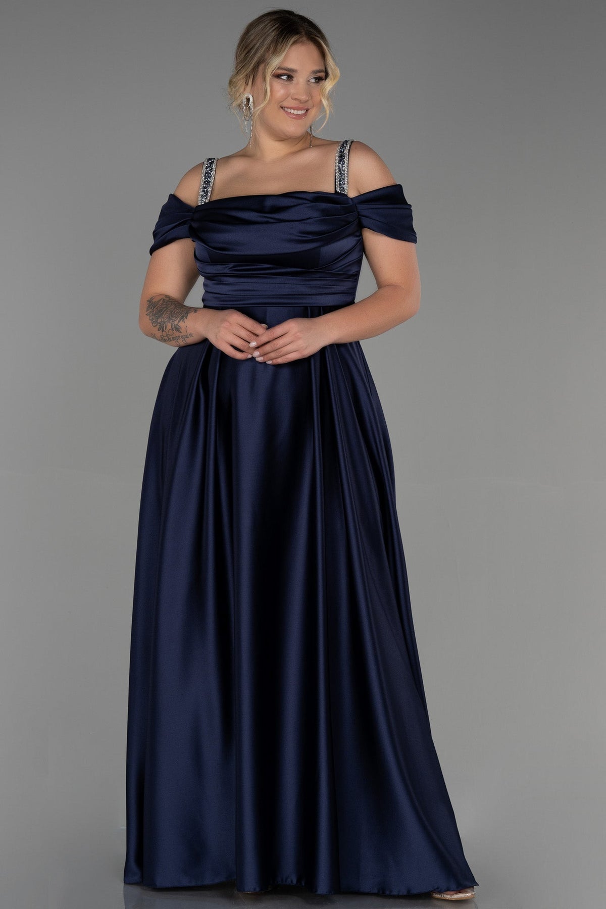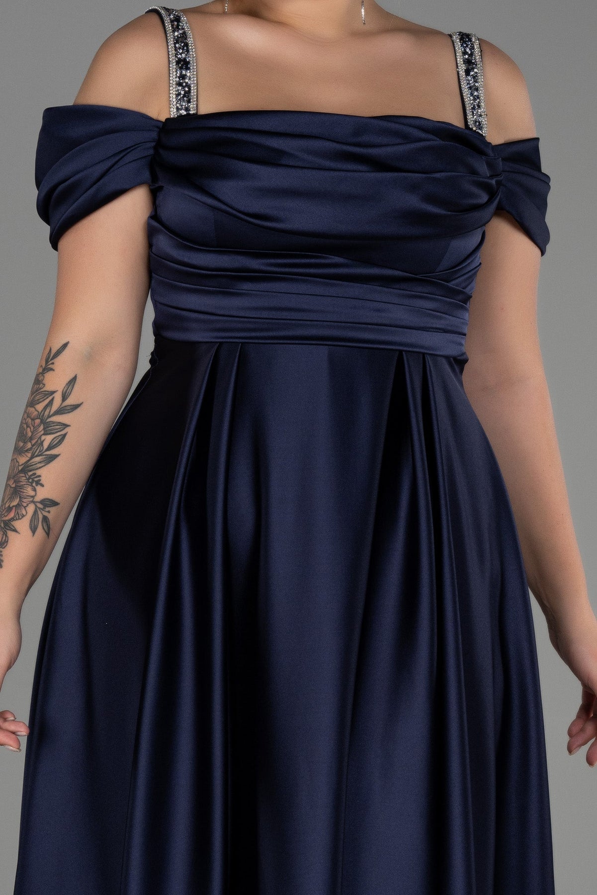 Duga vjenčanica od satena s naramenicama od strasa - Tamno plava