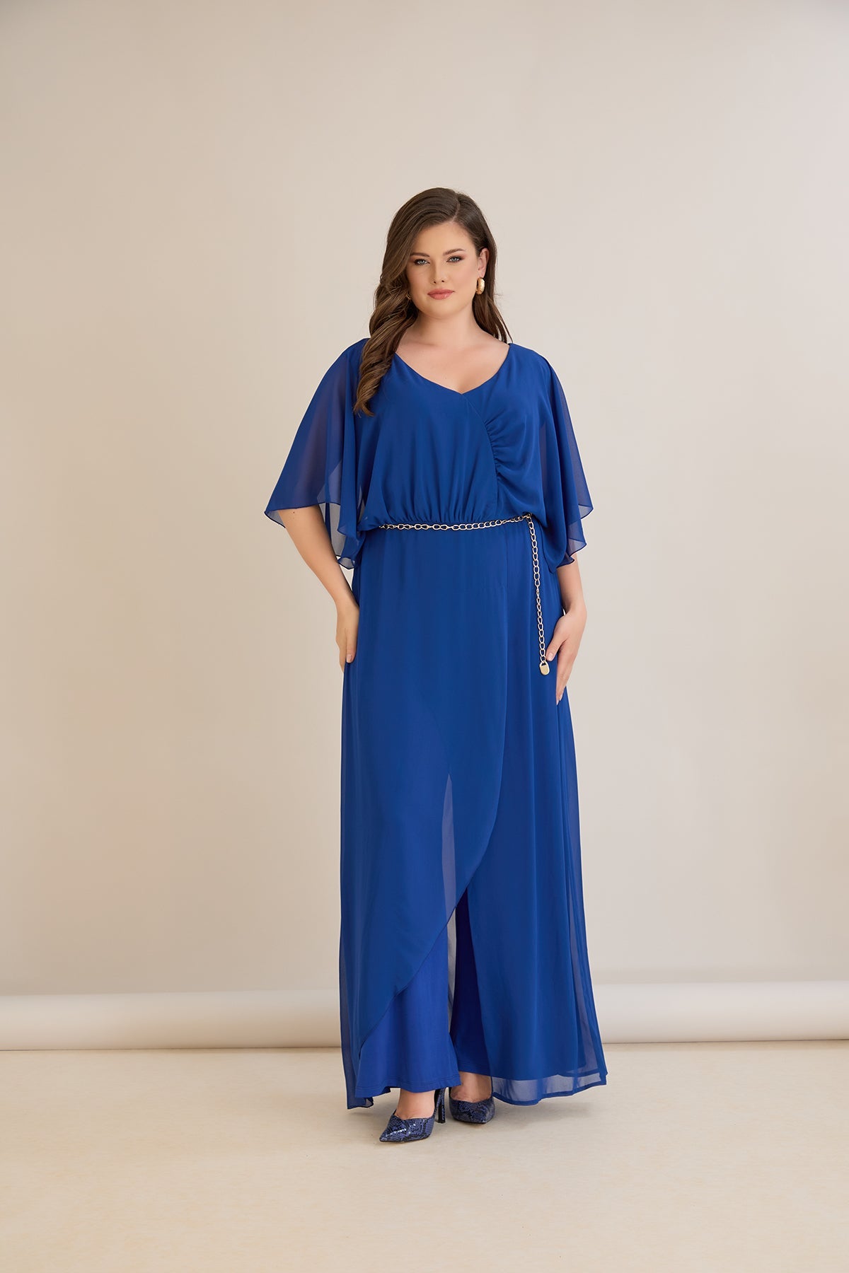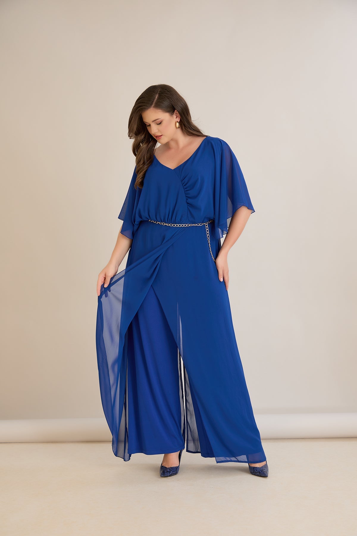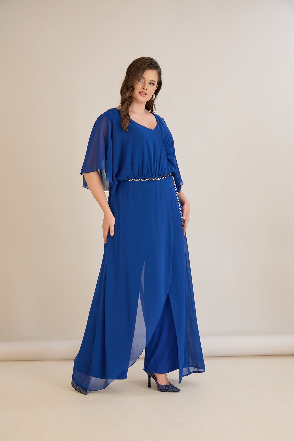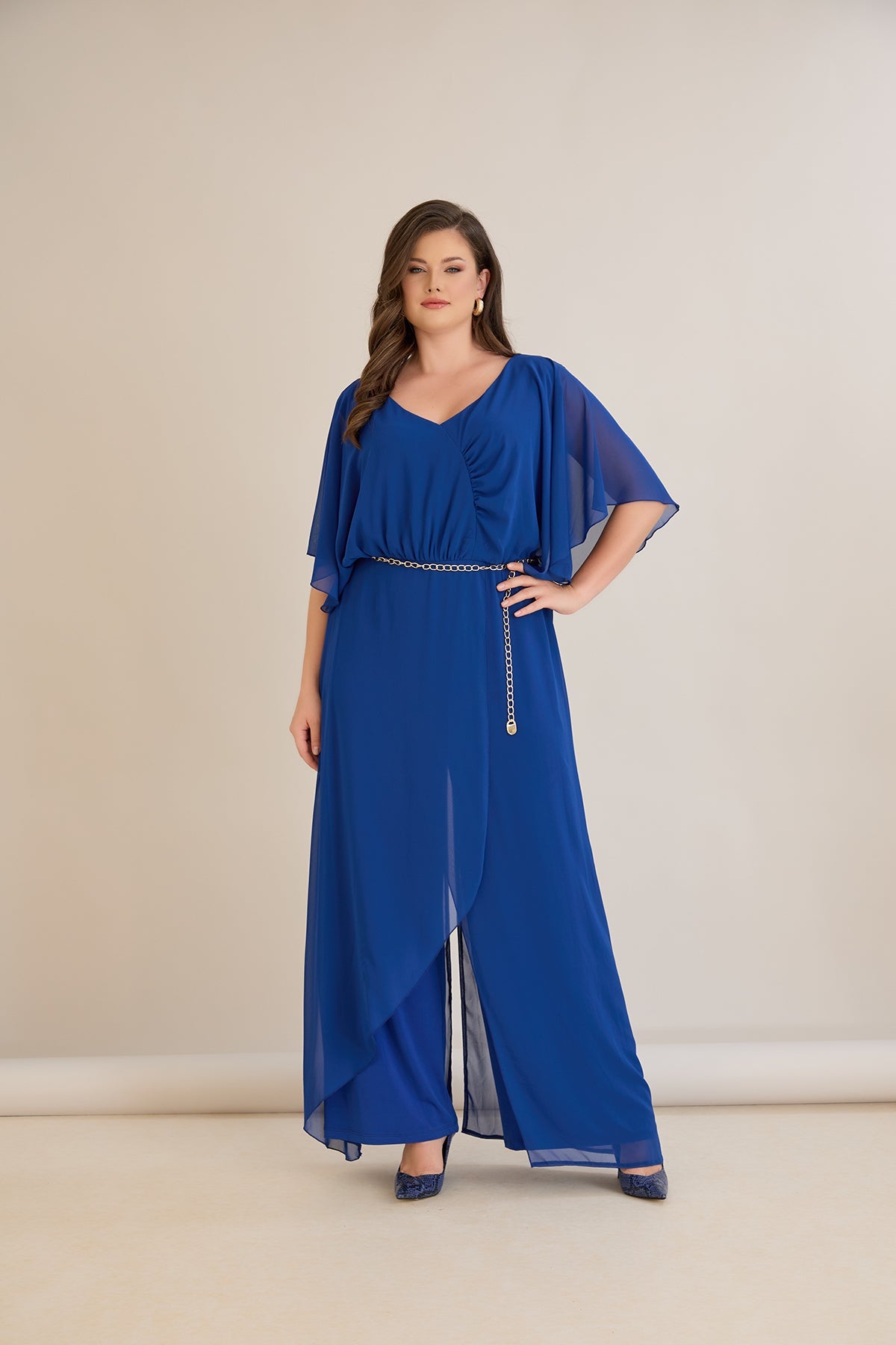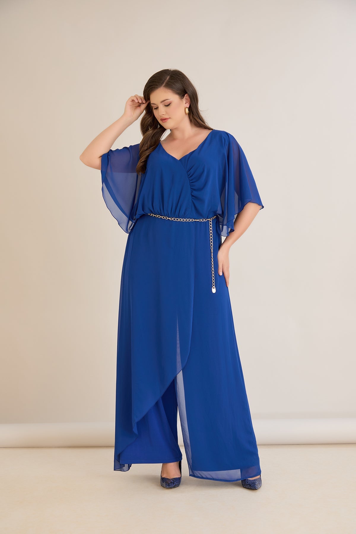 Plavi šifonski kombinezon s lančić remenom – Veći brojevi