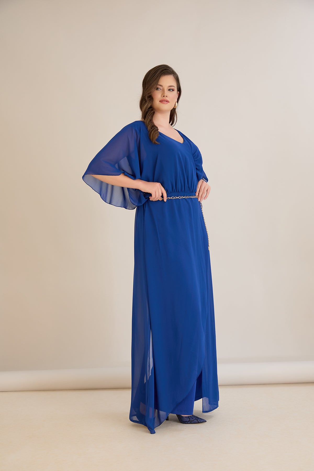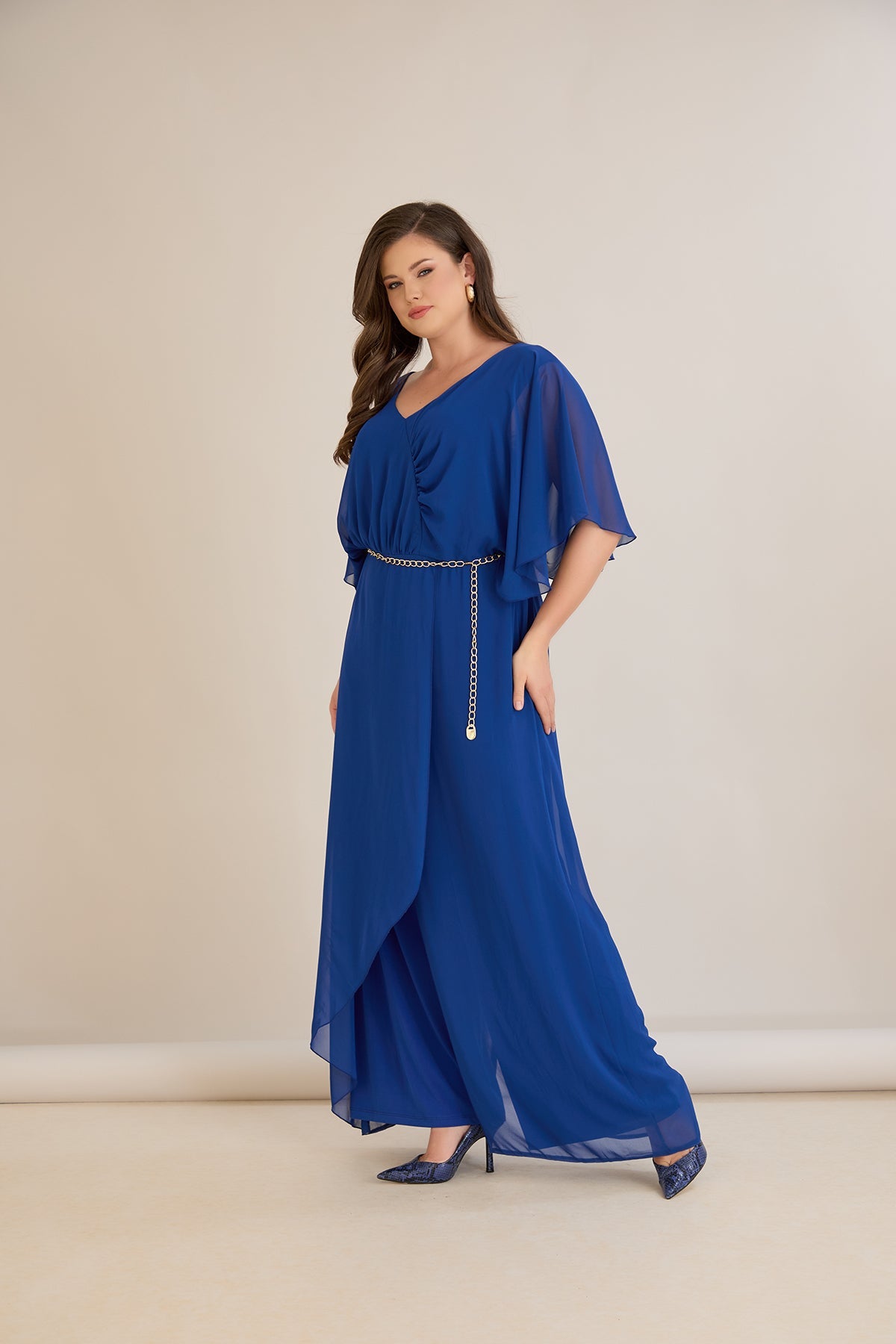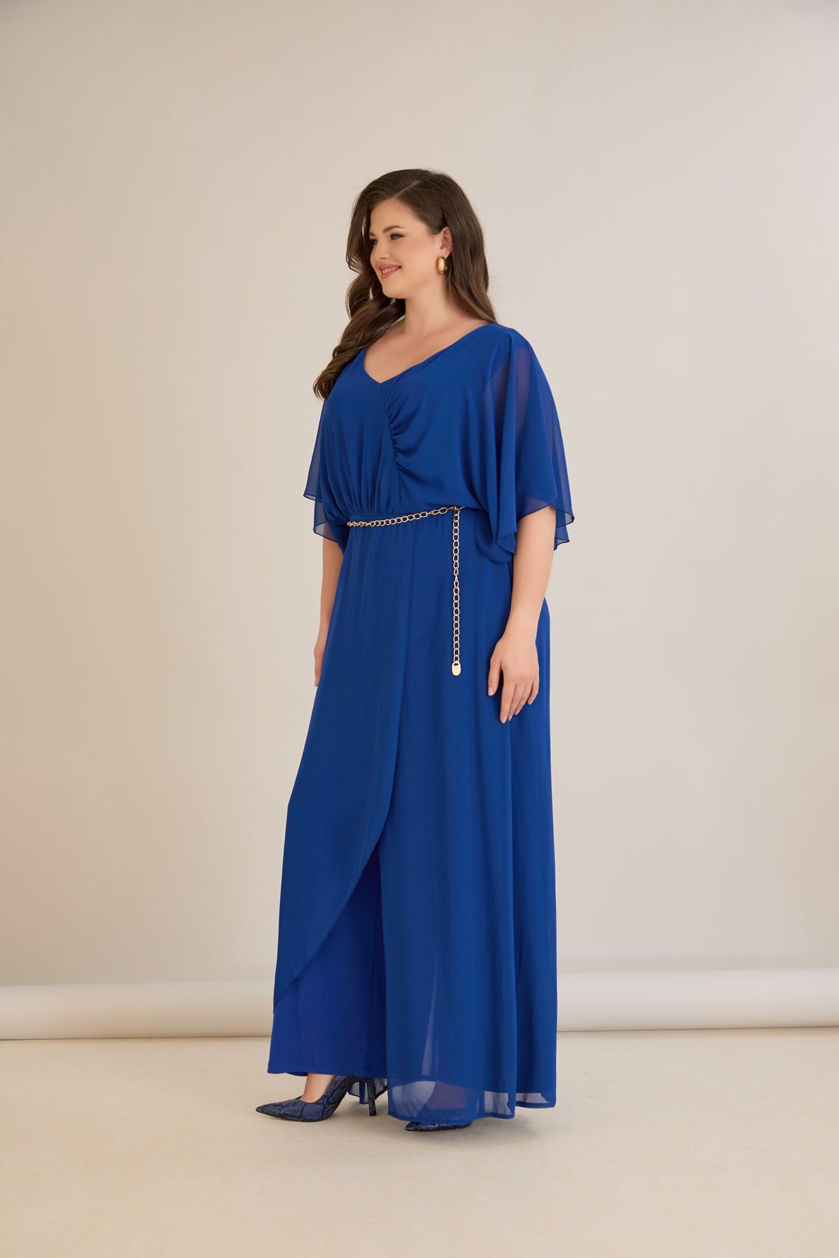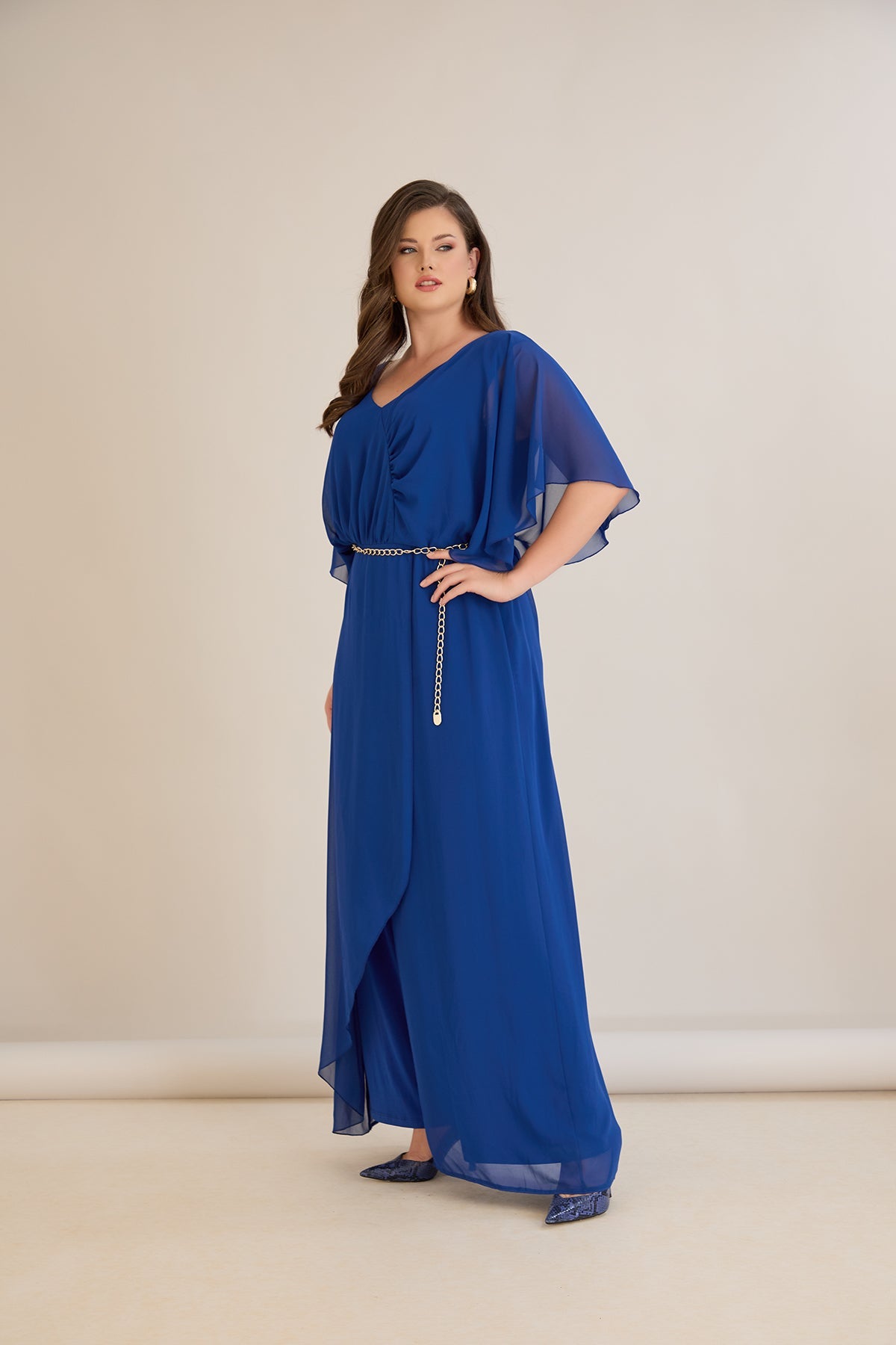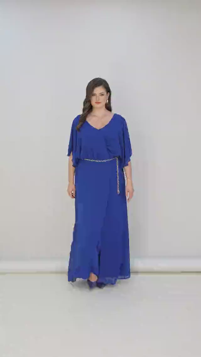 Plavi šifonski kombinezon s lančić remenom – Veći brojevi