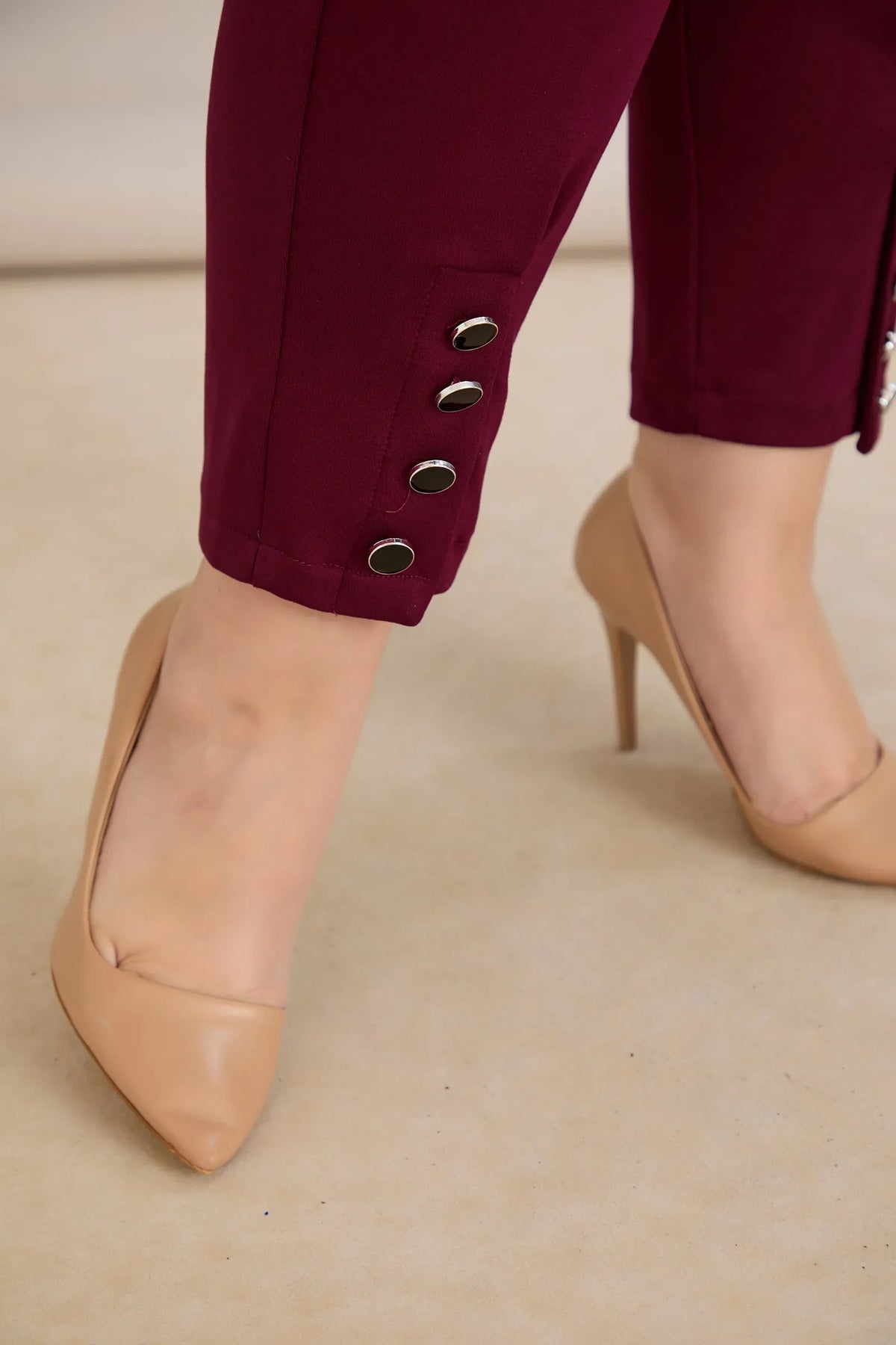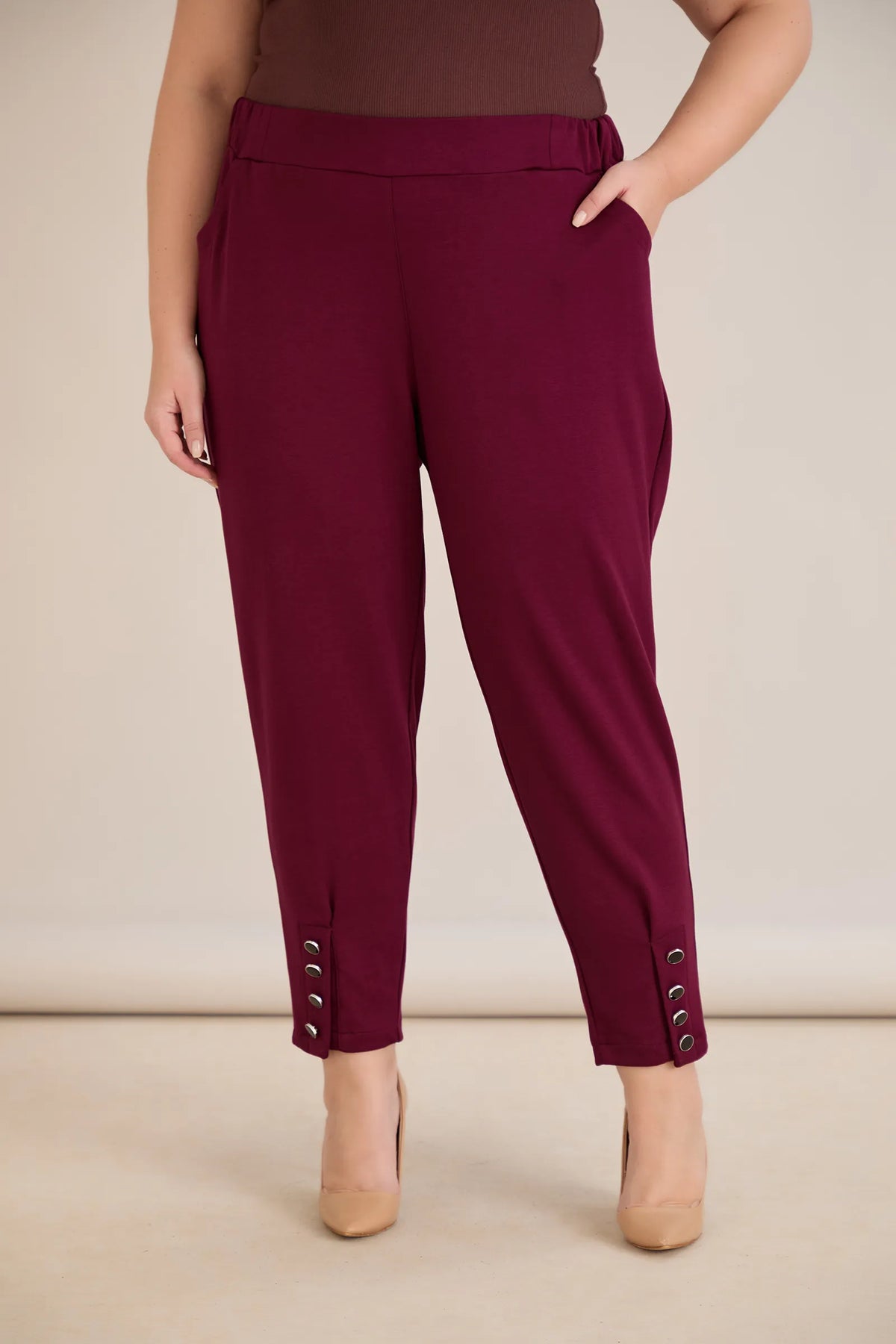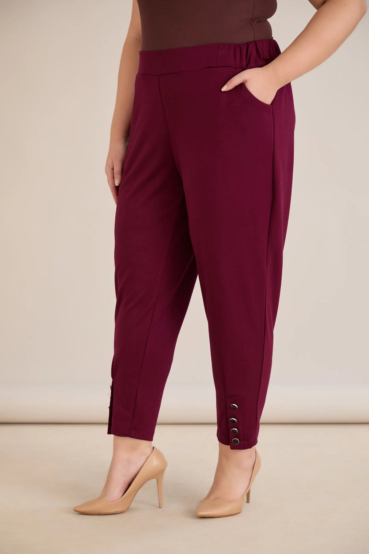 Elastične ženske hlače s gumbima u bordo boji