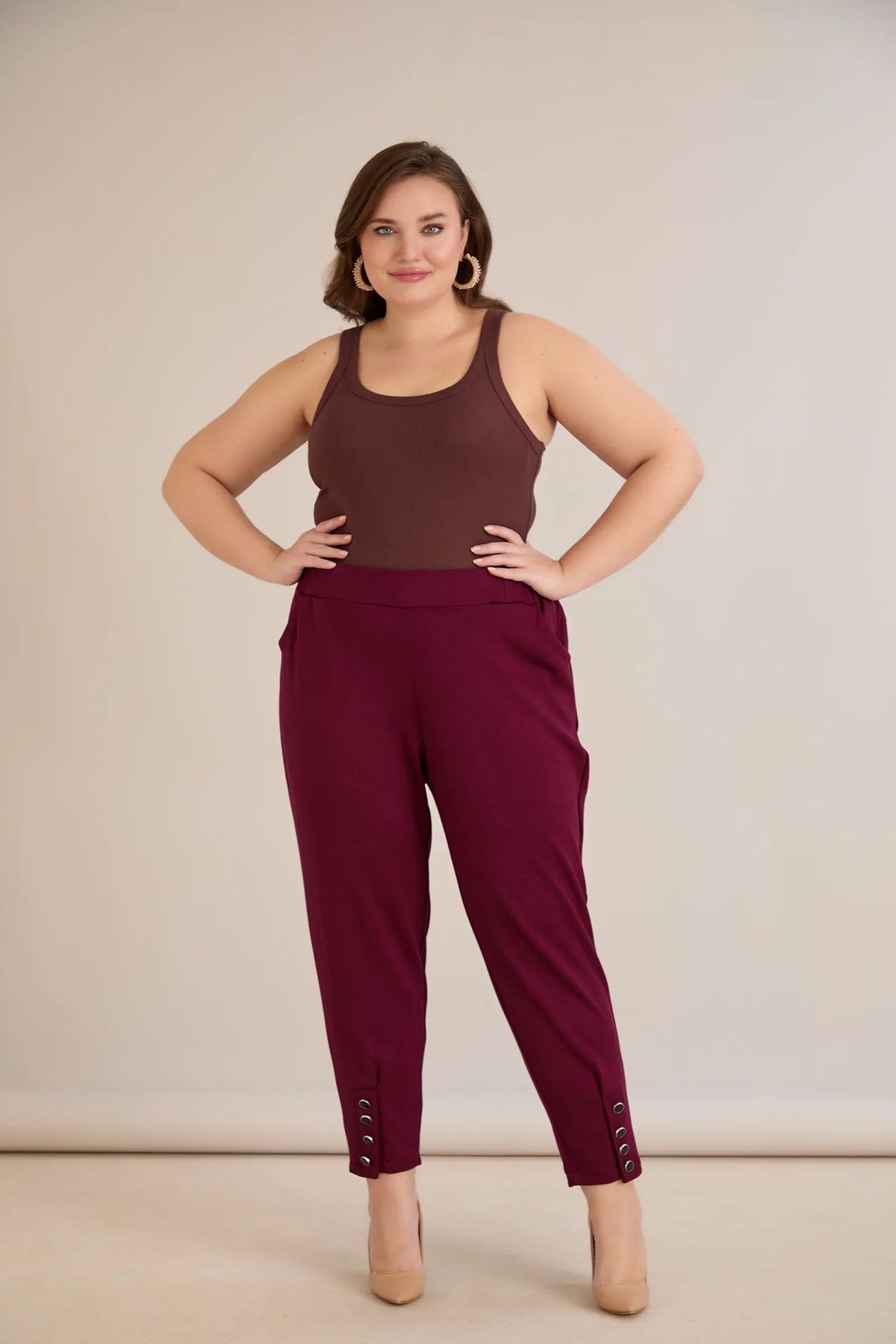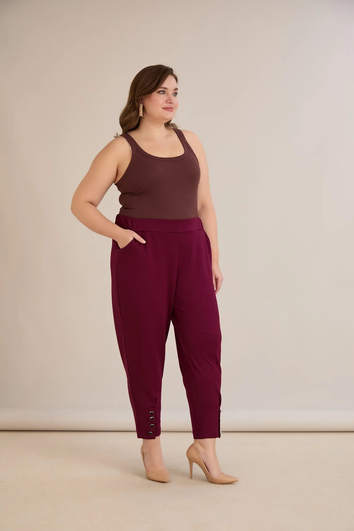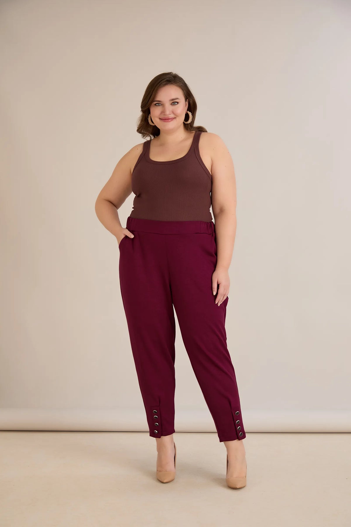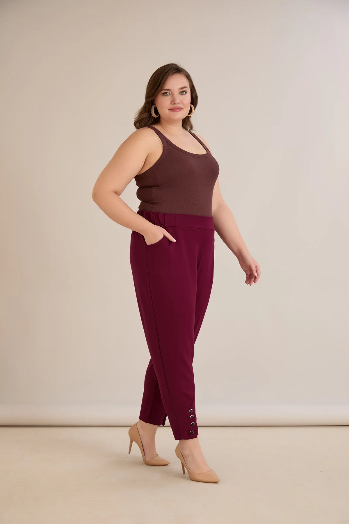 Elastične ženske hlače s gumbima u bordo boji