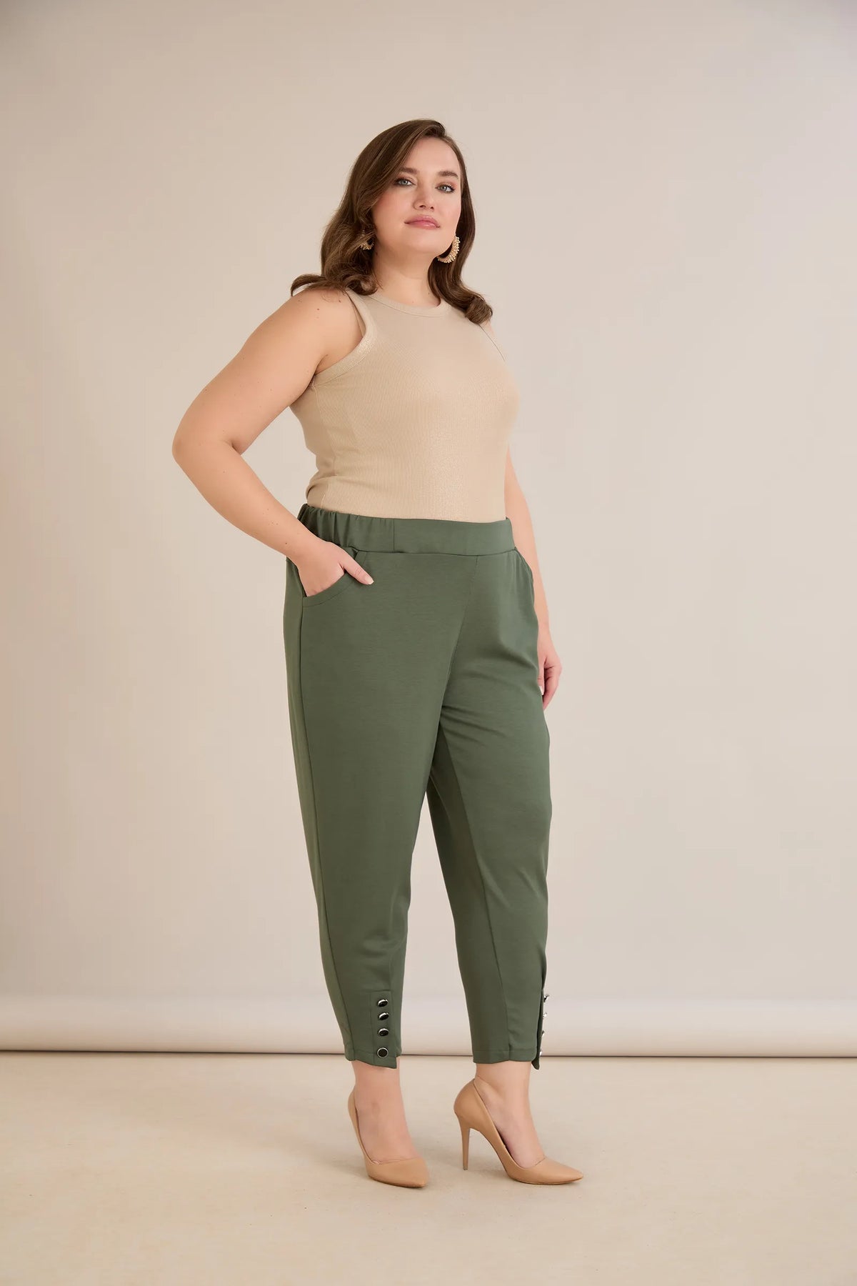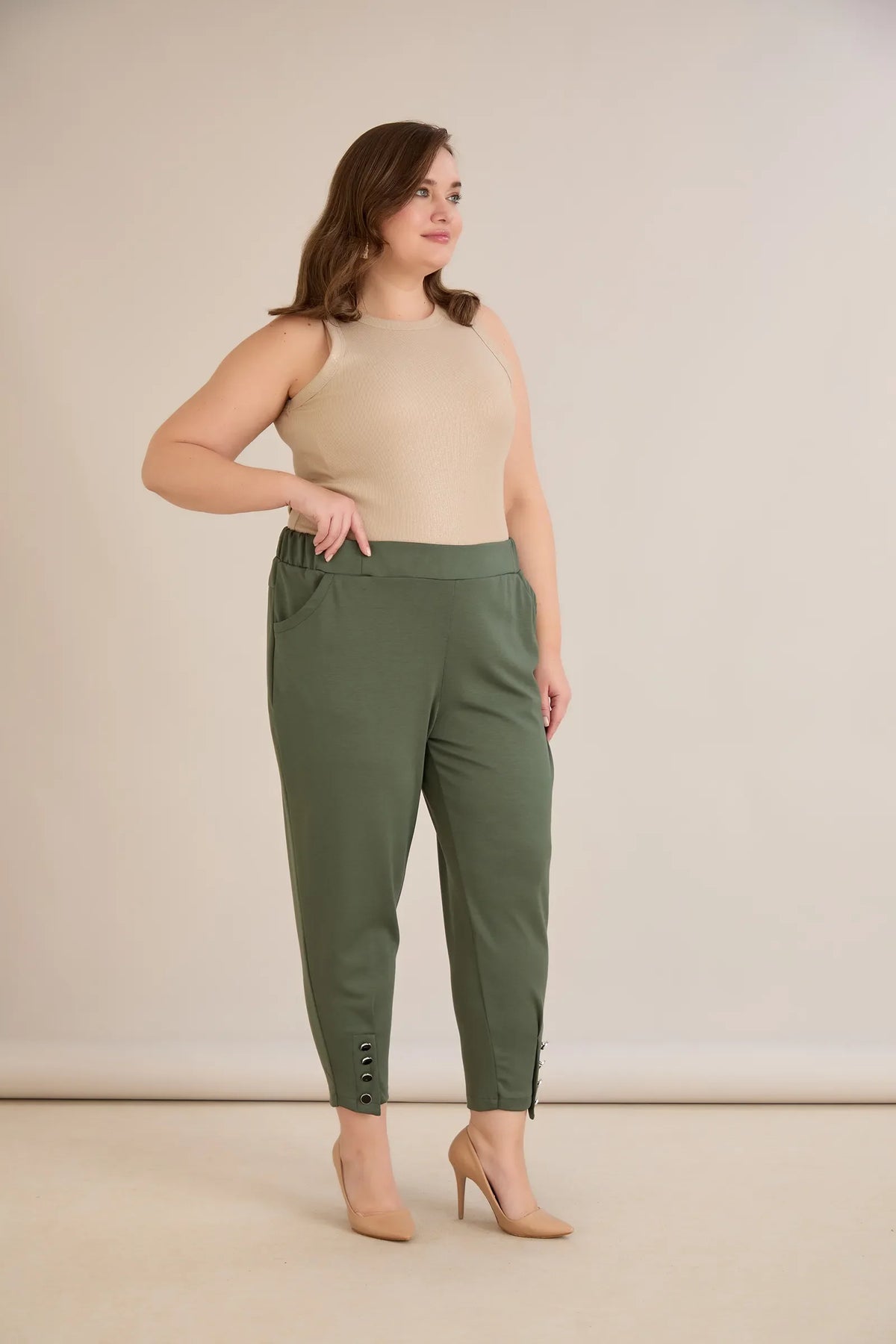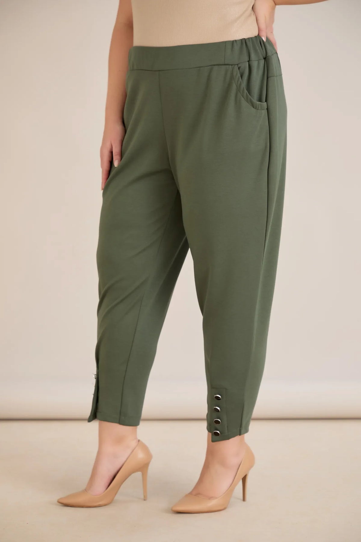 Elastične ženske hlače s gumbima u boji masline