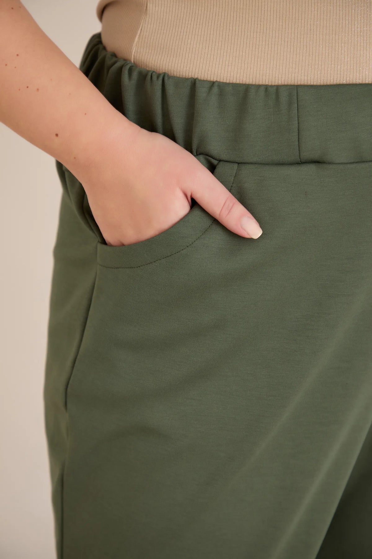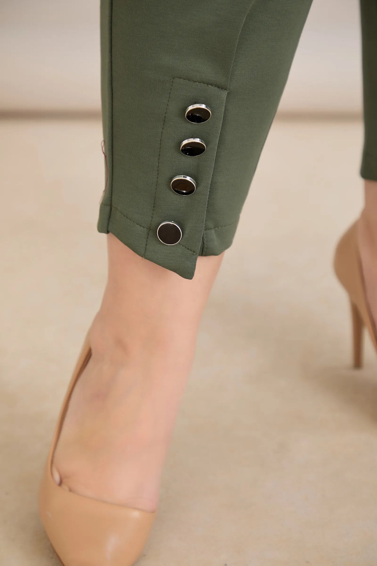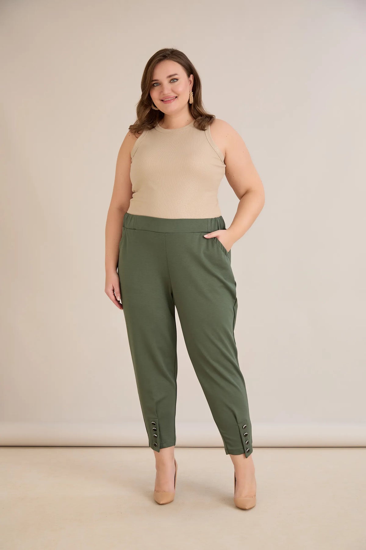 Elastične ženske hlače s gumbima u boji masline